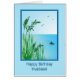 A lovely sea fishing scene. A wonderful birthday card for a husband who loves fishing, or just loves the sea. Tall grasses frame a view of a calm ocean with a small boat and a man fishing. The inside verse has the fisherman's good luck wish 'tight lines'.
