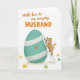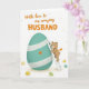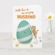 This design shows a soft digital illustration where a large teal oval with thin white horizontal bands sits in the lower left, like a decorated egg, with a bright orange heart centered on it 🌷. To the right, a small brown bear-like character stands upright on a white ladder, climbing with a careful grip and a tender, focused look that suggests it’s doing this for someone special 🐰. A tiny orange tag rests on its back, like a little note tucked in for a loved one. The background stays white and airy, letting the teal and orange stand out while keeping the scene gentle and romantic. Along the bottom, smaller patterned ovals in yellow and green scatter across the base like festive eggs laid out for a celebration. Small confetti-like dots float around the scene, adding motion without crowding the main figures. Across the top, the message “With love to my amazing HUSBAND” curves in orange lettering, with “HUSBAND” in all caps for emphasis. The ladder is bright white with evenly spaced rungs, leaning beside the teal oval as the bear-like character climbs upward.