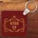 Funny keychain for country folks features gold "hush up" text and fancy frame .