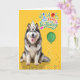 Husky Dog in a Party Hat on Yellow Birthday Card