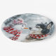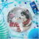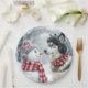 A husky dog and a snowman face each other surrounded by a snowy landscape