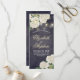 Wedding Program Rack Cards Templates - Elegant White Hydrangea Flowers and String Lights on Vintage Navy Blue Floral Linen Background.