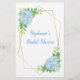 This bridal shower game is a love song game. The hostess plays snippets of love songs. The guests write the name and the artist on the cards. Points are scored for each correct answer. The player with the highest points wins a prize. These cards feature a watercolor blue hydrangea floral design with faux gold foil geometric frame on the back. Personalise these cards with the bride's name. Matching items available.