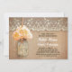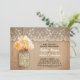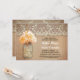 Cute rustic rehearsal diner invitation featuring mason jar with peach orange colour hydrangea blossom. Perfect invite for country rehearsal dinner with vintage lace and distressed wood accents.