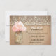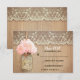 Rustic old wood background, vintage ivory lace and cute mason jar with pink hydrangea blossom hanging on the little rope - perfect wedding RSVP cards for country wedding theme with mason jars.