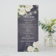 Wedding Menu Rack Cards Templates - Elegant White Hydrangea Flowers and String Lights on Vintage Navy Blue Floral Linen Background.