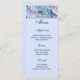 Menu Card is shown on basic white paper with a light blue background colour with a colourful hydrangeas print. Script and standard text in light Black.