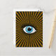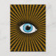 illustration of blue eye with dark golden sun rays beaming straight out and in swirl pattern against a black background. Talisman for self-hypnosis.