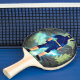Do you know a person that loves to play ping pong and also likes Ninja movies? This will makes a great gift for him or her. This Ninja style warrior has on his black attire standing in a camouflage background. His super power makes him glow. Very fun unique design ping pong paddle.