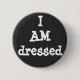 Funny "I AM dressed" button for covid-19 corona virus pandemic stay at home or work from home. For the new normal attire, like T-shirts, sweat pants or pyjamas.