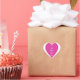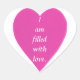 Painting of a pink heart on a white background, with the statement, I am filled with love, in white, is printed on white, heart shaped stickers. Purchase at PositiveAffirmation on Zazzle.