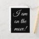 This minimalist change-of-address postcard design features the message "I am on the move!" on the front, and a customisable message on the back. Postcards like this might be used to share the sender’s new home address with friends and family.