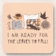 This cosy fall design perfectly encapsulates the anticipation and warmth of the autumn season with the phrase "I Am Ready For The Leaves To Fall!" The text is written in a playful, hand-drawn font that complements the inviting, homey illustrations above it. The design features a collection of comforting fall essentials: a steaming cup of coffee, an open book, a pair of glasses, a fluffy pillow, a plaid blanket, and a fallen leaf, all arranged in a charming, relaxed composition. The soft, warm colour palette, dominated by shades of beige, brown, and orange, evokes the peaceful and nostalgic feelings of autumn.