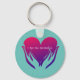 This keychain features a large pink heart held in 2 hands on a serene aqua blue background.