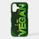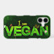 I am vegan written in bright green on a dark green canvas like background. The word vegan is written with a green grassy looking texture. Little nature themed ladybugs, daisies and leaves decorate the words.
