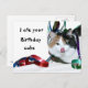 Long haired calico cat with ribbons and a tongue licking her chops admits to eating the birthday cake humourous birthday postcard