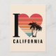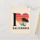 Send a little sunshine from the Golden State with this stylish postcard featuring a bold I ❤️ California design on a warm antique white background. The eye-catching layout includes a large “I,” a retro-striped heart in sunset-inspired hues (red, orange, taupe, green, teal, and blue), breezy palm trees, and customisable text—perfect for showcasing your favourite California beach town like Santa Monica, Pismo Beach, San Francisco, or anywhere you call home.
