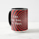 Let everyone know that you can help them using hypnosis and hypnotherapy with this red and black hypno-disc spiral mug/cup.
