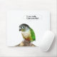 On this cute mousepad, a green cheek conure is shown asking the question, "I can talk, can you fly?"