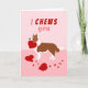 I chews you Border Collie Valentine's Day card, cute Border Collie dog holding a valentine heart on a pink heart background.