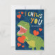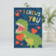Cute Valentine's Day card for kids featuring an illustration of a green t-rex holding a red heart on a blue background with the words "I choose you". Design by Shelby Allison.