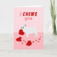 I chews you French Bulldog Valentine's Day card, cute Frenchie dog holding a valentine heart on a pink heart background.