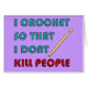 A tongue in cheek slogan 'I crochet so that I don't kill people' with a cartoon crochet hook.