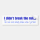 Let the world know that it's not your fault that rules were broken! Reads "I didn't break the rules. The rules were already broken when I got here." Have your excuse ready for them!