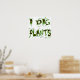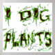 I Dig Plants funny gardener saying in green messy letters, with lots of dirt around the edges. A funny gardening slogan by theGardenPages.com