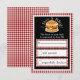 Fun, casual wedding RSVP card for the laid back barbecue wedding! Design features red and white gingham plaid trim. The centre of the invitation front is black with white trim. There is customisable text in a fun white, chalk like font where you can add your reply by date. Above the text is a yummy hamburger graphic with text in the same white font that says I Do's & BBQ! Below are three white rectangles with red gingham plaid trim. Inside the white boxes are text in black chalk like font and check boxes so your guests can write in their name and check their attendance. The reverse side of the RSVP card is covered in the red gingham plaid. Matching wedding invitations, stamps and paper plates also available.
