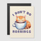 Embrace your morning grumpiness with this adorable greeting card featuring a cute orange cat and the witty phrase, 'I Don’t Do Mornings.' Perfect for cat lovers, coffee enthusiasts, and night owls, this playful design captures the essence of those who need coffee before taking on the day. A great gift for cat enthusiasts and grumpy morning personalities alike!