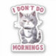 Start your day with a touch of humour and feline charm with this 'I Don’t Do Mornings' sticker! Featuring a sleepy grey cat holding a cup of coffee, this adorable artwork is perfect for cat lovers and coffee enthusiasts alike. A delightful gift for anyone who isn’t a morning person, this design adds a playful twist to your everyday routine.