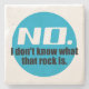 Are you tired of people asking you to identify unknown rocks? This stone geology coaster features the phrase "No. I don't know what that rock is." over a blue circle background.