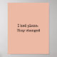 A simple and calming art print with the quote “I had plans. They changed” The design features black typewriter font, bringing a modern feel to any space. Perfect for living rooms, bedrooms, or home offices. The background color can be changed to match your interior style. This minimalist quote print adds a peaceful touch and reminds you to slow down and enjoy the moment. Great for boho, Scandinavian or neutral home decor.