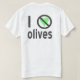I hate olives. Design uses black letters, a green heart and the international "NO" sign to read , "I hate olives". For those that do not "heart" them, really dislike them, but have a sense of humour (humour), love to laugh and have their funny bone tickled.