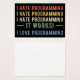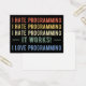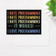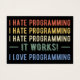 'I Hate Programming. It Works! I Love Programming' funny quote for programmers, tech enthusiasts, coders, and developers.