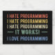 'I Hate Programming. It Works! I Love Programming' funny quote for programmers, tech enthusiasts, coders, and developers.