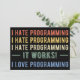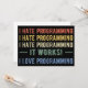 'I Hate Programming. It Works! I Love Programming' funny quote for programmers, tech enthusiasts, coders, and developers.
