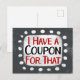 "I Have A Coupon For That" is a cute text design in grey with black and red text, along with a white accent shape and white textured whimsical dots surrounding it.