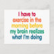 Great gift for fitness fanatics and exercise enthusiasts! Reads "I have to exercise in the morning before my brain realises what I'm doing."