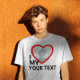 Create your own I Love My Photo Text T-Shirt with this modern and funny shirt template featuring a cool modern sans serif font and girlfriend, wife, boyfriend or husband photo into a huge red heart. Add your own photo, your name or any personalised text. The "I love My Girlfriend" t-shirt design template is perfect for creating valentines, anniversary and birthday gifts. No minimum order, but select more quantity for stay in budget and enjoying a cheapest price per shirts. Make your own unique gift for your boyfriend with this I love my girlfriend t-shirt!