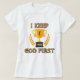 This woman's t-shirt showcases a unique bold print font with golden coloured letters navy blue outline displaying the phrase “I Keep God First” with a 1st place trophy plus a floral theme on each side in the centre displaying the name God in this faith based bible theme. This tee feature a relaxed fit for the female shape made from 100% cotton this shirt is both durable and soft which make a great combination.