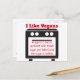 I Like Vegans funny anti-vegan postcard makes fun of vegans, saying in big, bold letters: "I Like Vegans." Then beneath, in smaller letters on an oven door, the punchline says, "wrapped in bacon, sprinkled with brown sugar, and baked until the sugar is bubbly." Mmmm--tasty, right? It's all in jest, and the sarcastic saying on this postcard is sure to bring a laugh to recipients, whether vegan or non-vegan. Is it an offensive postcard? Not if you have a sense of humour. Get a bunch; laughter helps get rid of all those toxins we're surely eating.