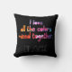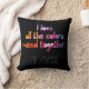 This plain black pillow features a watercolor rainbow caption that reads: "I love all the colour mixed together" and the word "BLACK" in all caps black font with a white outline.