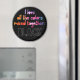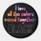 This plain black magnet features a watercolor rainbow caption that reads: "I love all the colour mixed together" and the word "BLACK" in all caps black font with a white outline.