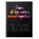 This plain black notebook features a watercolor rainbow caption that reads: "I love all the colour mixed together" and the word "BLACK" in all caps black font with a white outline.