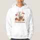 Autumn and Fall scenery with old distressed haunted farm house and ghost set against golden rolling hills and autumn trees with yellow sun or moon with orange clouds and umbrella, kid in Halloween costume, Scary horror movie cinema screen, popcorn, movie tickers, harvest pumpkins, candy apples, mushrooms, fall leaves, football, fall and winter sweater and Wild Thanksgiving Turkey. Text reads: I Love Autumn