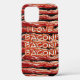 Everything's better with BACON! Even your phone case. Strips of bacon are the background for the text, "I Love Bacon! Bacon! Bacon!".