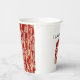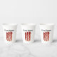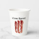 Paper party cups have 3 strips of bacon with text that reads, "I Love Bacon!". The back of the cup has overlapping strips of bacon. Matching paper party napkins and plates are also available in this store.