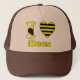 I love bees hat. Text: I-Heart Bees. The heart is with black and yellow stripes. Colors: yellow, black and white. The letter ‘B’ shows wings of an animal.